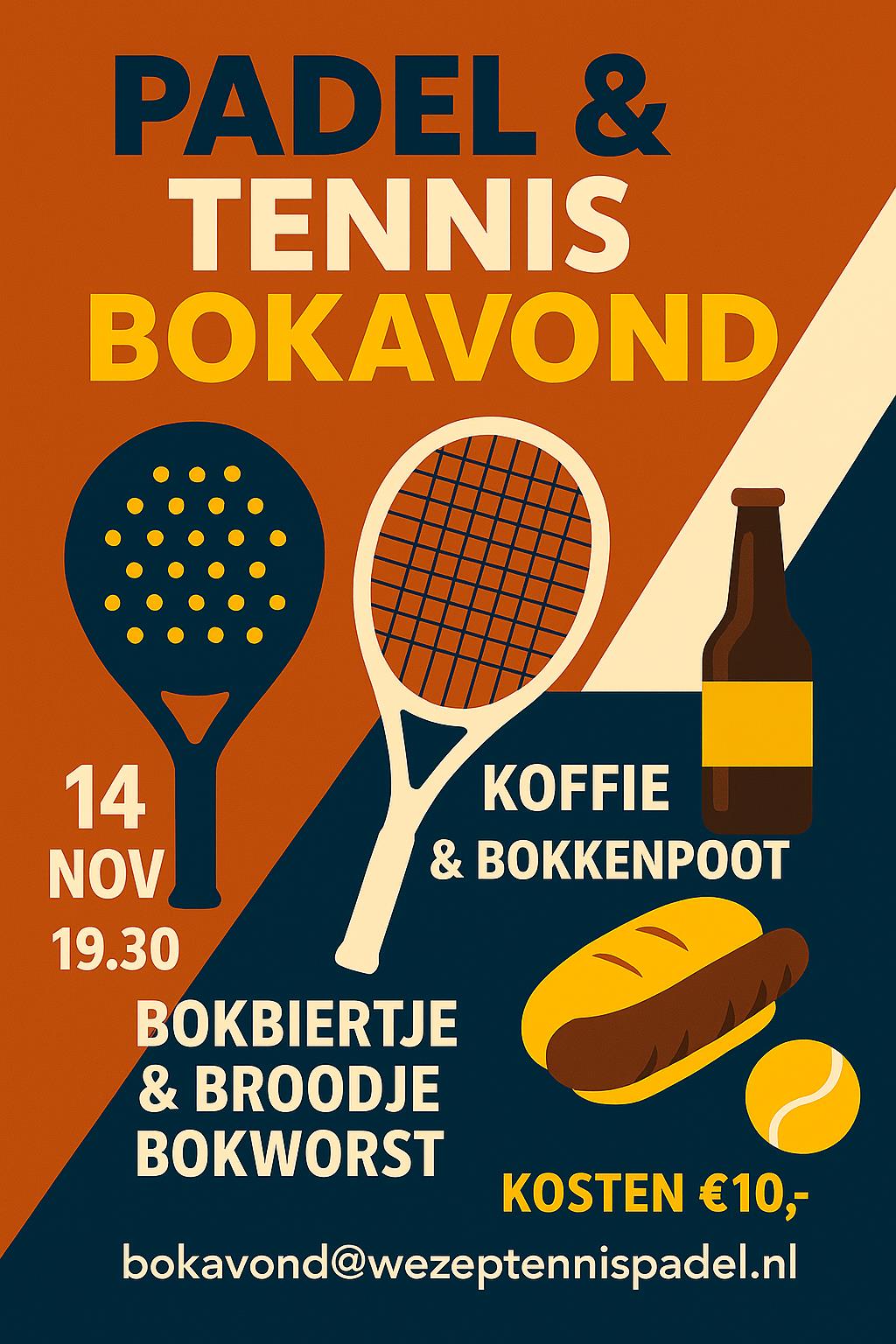 Bokavond 2025 staat voor de deur. Deze is op vrijdag 14 november as. De eerste aanmeldingen druppelen al binnen, maar hierbij de directe uitnodiging aan elke heer, jong of oud (18+), beginner of superervaren: de bokkenavond is de gezelligste afsluiter van het tennis-en padeljaar!