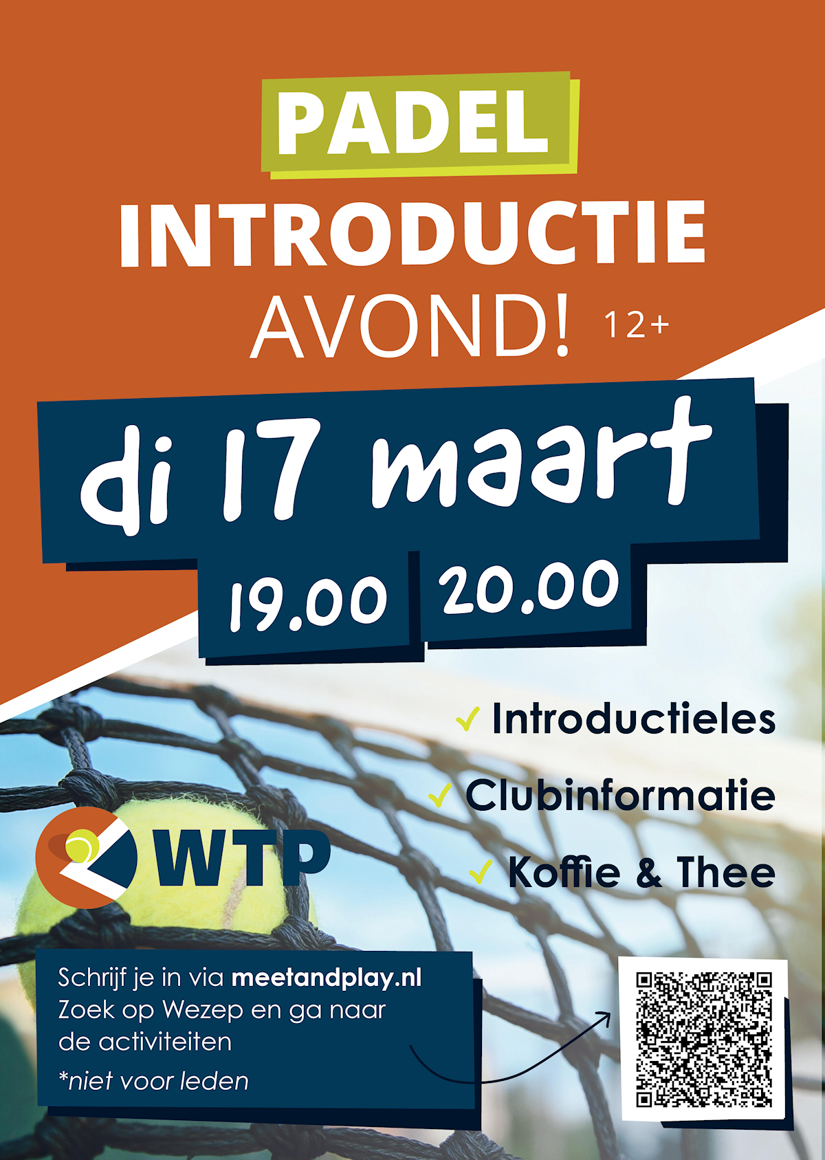 Ben jij benieuwd of padel een sport voor jou is? Geef je dan op voor een proefles padel bij WTP op dinsdag 17 maart. Er zijn 2 lessen, de eerste start om 19 uur en de tweede les start om 20 uur. De lessen duren ongeveer een uur, daarna kun je in de kantine nog vragen stellen. Opgeven kan via meet&play, de lessen zijn bedoeld voor niet leden van WTP.